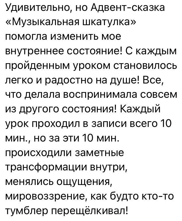 Так сложилось, что записывая эту Адвент-сказку, я вложила в нее все актуальные смыслы, которые транслирую женщинам в своих практикумах (контакт с собой, самоценность, самоподдержка, выход в свое звучание)! И это прекрасная возможность в коротких аудионастройках соприкоснуться с ними целостно.